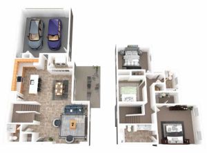 A unique open concept L-shaped living/dining/kitchen area. The kitchen sits in the corner of the L and features ample countertops, a pantry and an island with a two bowl sink and dishwasher, with extended countertop for bar seating or serving. The large lanai is accessible from the living area. There's a powder room on the main level. Upstairs, you'll find a restful master suite with large walk-in closet and a private bath with double sinks. The two secondary bedrooms have nice sized closets share the full hall bath. A second story laundry and interior storage area keep things organized. The attached two car oversized garage offers additional storage.