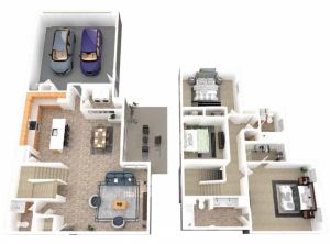A unique open concept living/dining/kitchen area. The L-shaped kitchen sits in the corner and features ample countertops, a pantry and an island with a two bowl sink and dishwasher, with extended countertop for bar seating or serving. The large lanai is accessible from the living area. There's a powder room on the main level. Upstairs, you'll find a restful master suite with large walk-in closet and a private bath with double sinks. The two secondary bedrooms have nice sized closets - one is a walk-in - and share the full hall bath. A second story laundry and interior storage area keep things organized. The attached two car oversized garage offers additional storage.