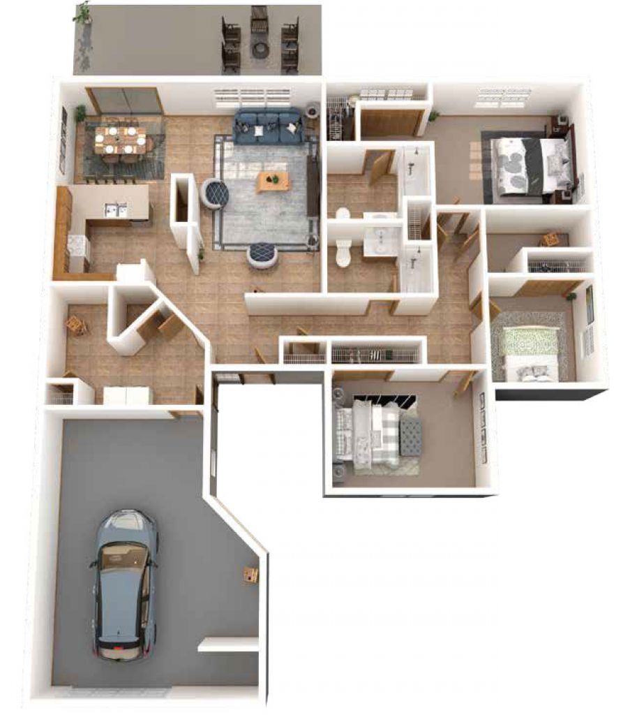 Nice flow! The large living room, dining area and kitchen are truly open concept. The kitchen is an U-shape to maximize counterspace and has a pantry. The lanai is accessible from the family room. The powder room and laundry are tucked out of the way. Upstairs, the master suite has a walk-in closet and private bath. The two secondary bedrooms share the hall bath. Interior storage on the second floor and the attached 1 car garage offer additional storage.
