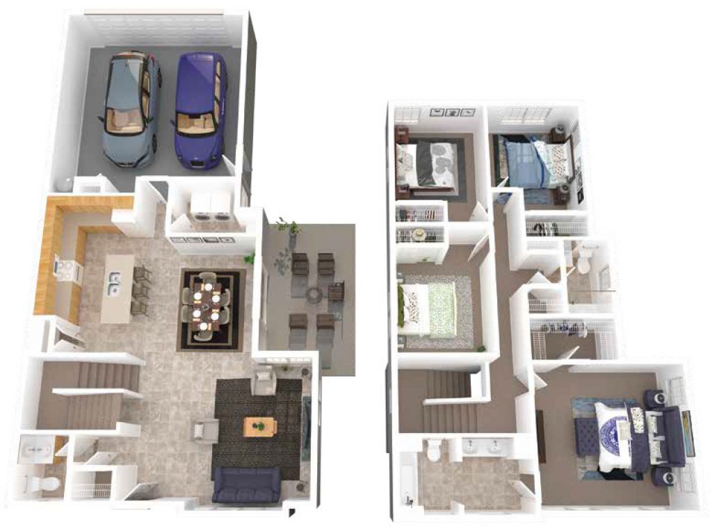 A unique open concept living/dining/kitchen area. The kitchen features ample countertops, a pantry and an island with a two bowl sink and dishwasher, with extended countertop for bar seating or serving. The large lanai is accessible from the dining area. There's a powder room on the main level. Upstairs, you'll find a restful master suite with large walk-in closet and a private bath with double sinks. The three secondary bedrooms have nice sized closets and share the full hall bath. A second story laundry and interior storage area keep things organized. The attached two car oversized garage offers additional storage.