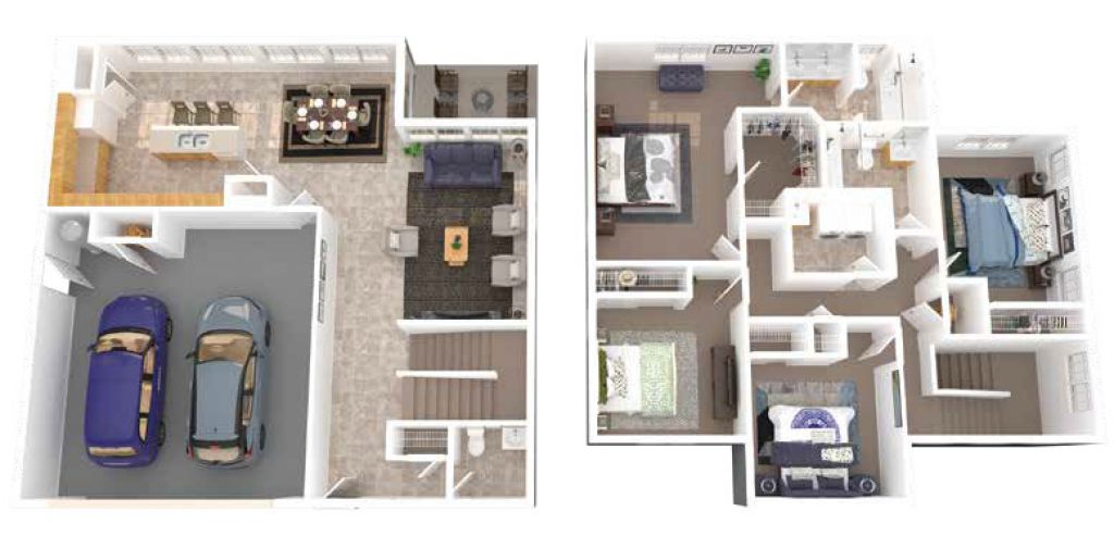 This is a great open floor plan. The L-shaped kitchen maximizes counter space and has a pantry and separate island with double bowl sink and dishwasher. The extended countertop allows for bar seating and serving. The lanai is accessed from the dining area. A powder room is tucked away by the stairs. Upstairs, the master suite is a wonderful retreat. It has a huge walk-in closet and private master bath with two sinks. The three secondary bedrooms have good sized closets and share a hall bath. The upstairs laundry is so convenient and there's additional interior bulk storage. The oversized two car attached garage offers more storage opportunities.
