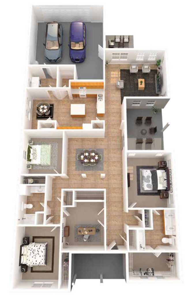 This modern, Single story, 3 bedroom, 2 bath home features central air conditioning, a large covered front porch, covered private lanai, a 2 car garage in the rear of the home (with extra storage space), and a modern open floor plan. The kitchen includes a nook area, modern appliances, a pantry, and an island breakfast. There is also a laundry room and storage room located nearby. Enjoy the view to the covered lanai from the good sized family room, the open dining room area, and the master bedroom suite. The large master suite with a walk-in closet and full bath with double sinks, also boast a huge walk-in closet. There is a private den located just across the hall. The remaining two good-sized bedrooms share the second full bath conveniently located between them.